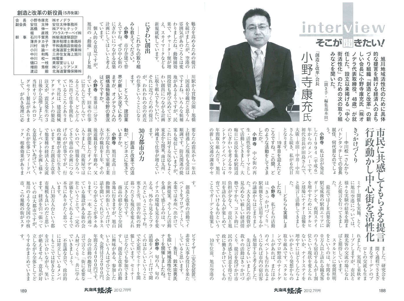 会長 小野寺康充のごあいさつは、後日掲載させていただきます。 月刊誌「北海道経済」2012年7月号にて、インタビューが掲載されていますので、ご参照ください。 (PDF:1.12MB)